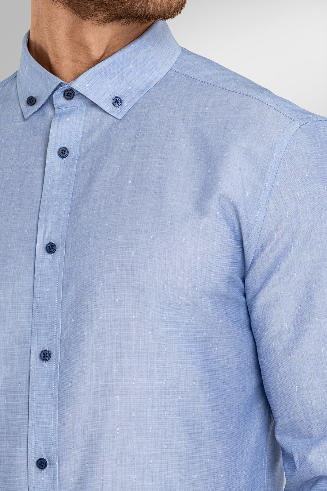 Límec typu button down podporuje uvolněnou eleganci a drží tvar i bez kravaty. Tmavě modré knoflíky vytvářejí decentní kontrast a podtrhují moderní charakter modelu. Klasické manžety zachovávají univerzálnost a umožňují snadné kombinování s lehkým sakem i samostatné nošení s vyhrnutými rukávy.