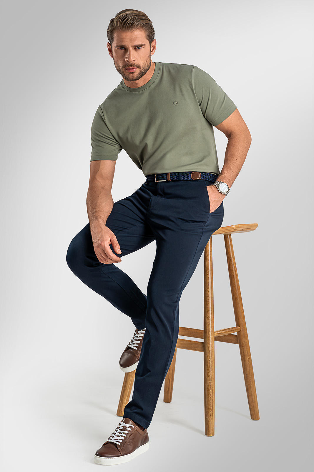 Přizpůsobte svůj outfit příležitosti – vyměňte košili a polobotky za bílé tenisky BANDI a svetr, a rázem vytvoříte pohodový casual outfit pro volný čas.