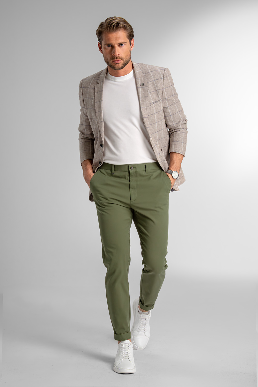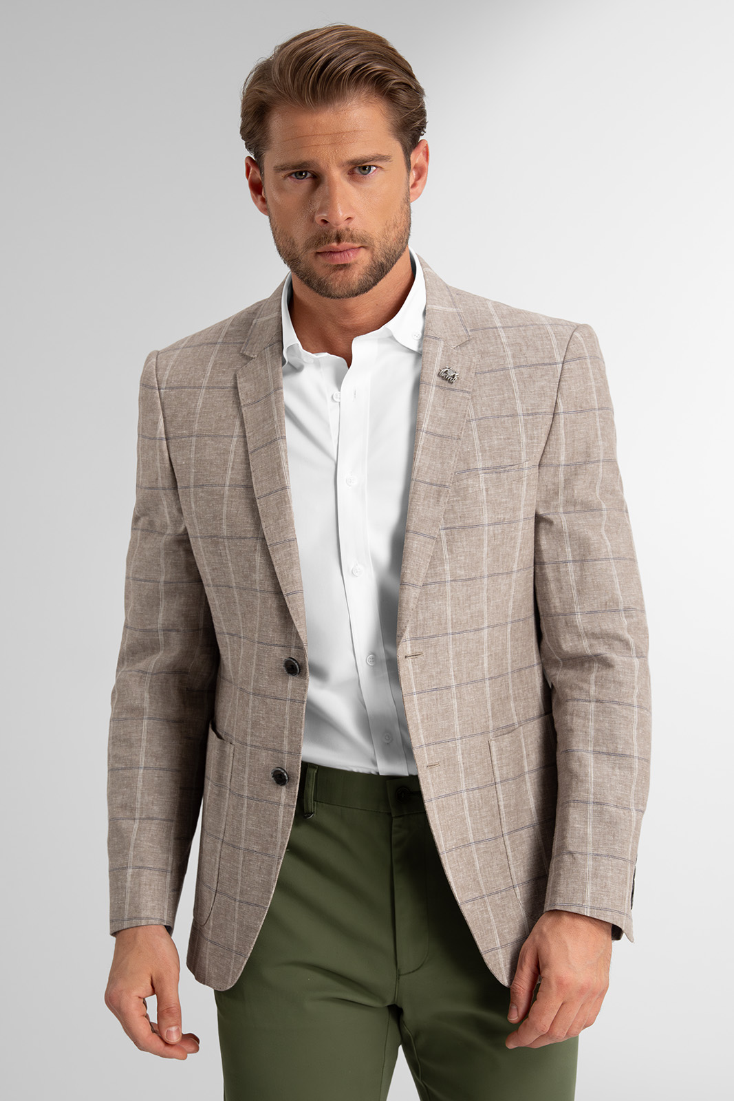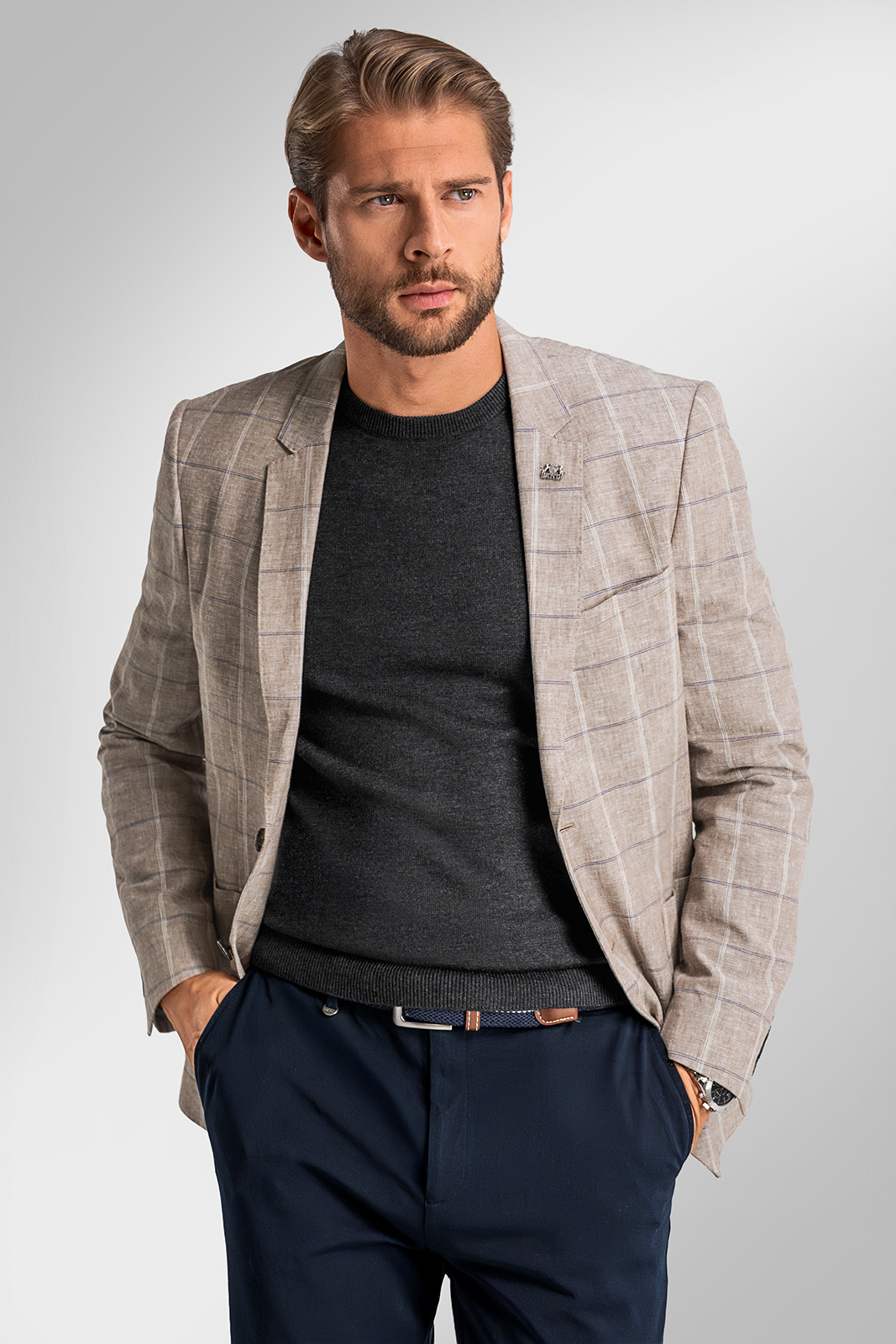 Kombinace lnu a bavlny zajišťuje pocit pohodlí během celodenního nošení v teplých letních dnech. Len dodává materiálu přírodní strukturu a bavlna přispívá k jemnosti a snadnější údržbě. Díky částečnému podšití v oblasti předního dílu a rukávů si sako zachovává lehkost a vzdušnost, aniž by ztratilo elegantní tvar.
