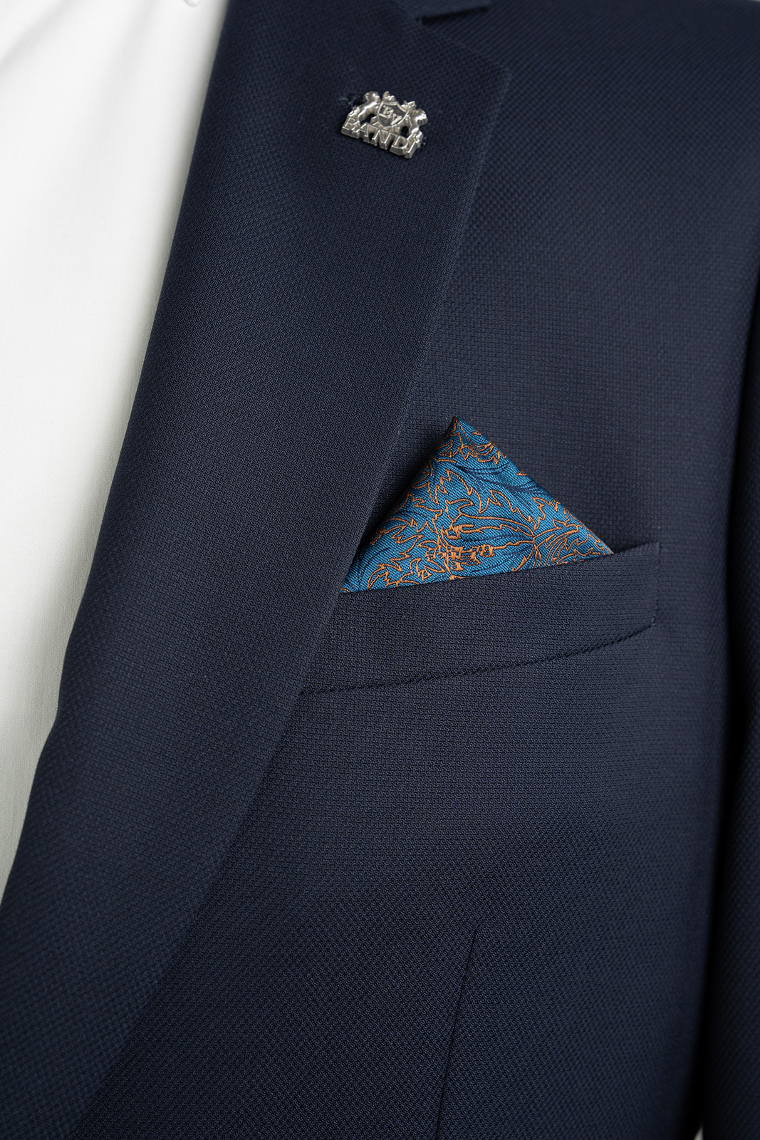 Chcete dodat svému outfitu šmrnc a podtrhnout svůj osobitý styl? Elegantní pánský kapesníček BANDI MERTO 03 v modré barvě s oranžovým ornamentálním vzorem je ideální volbou.